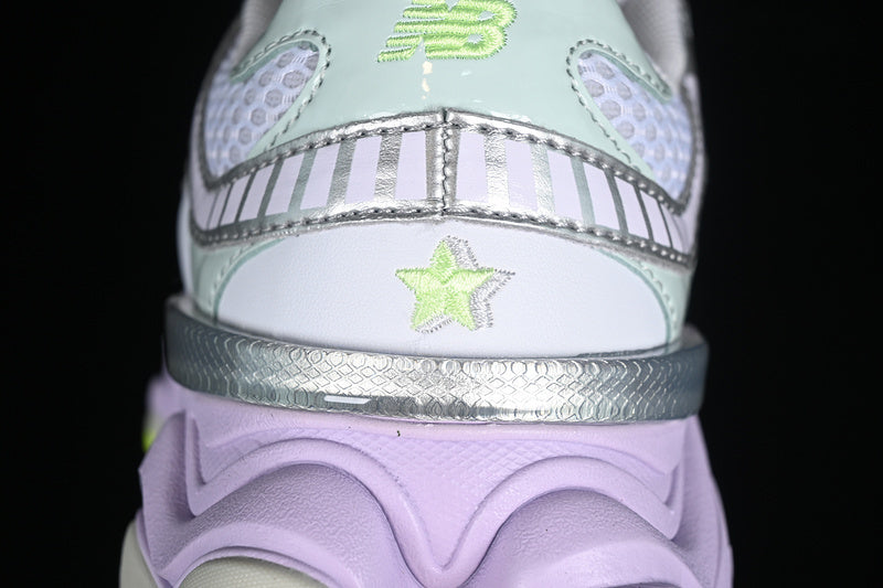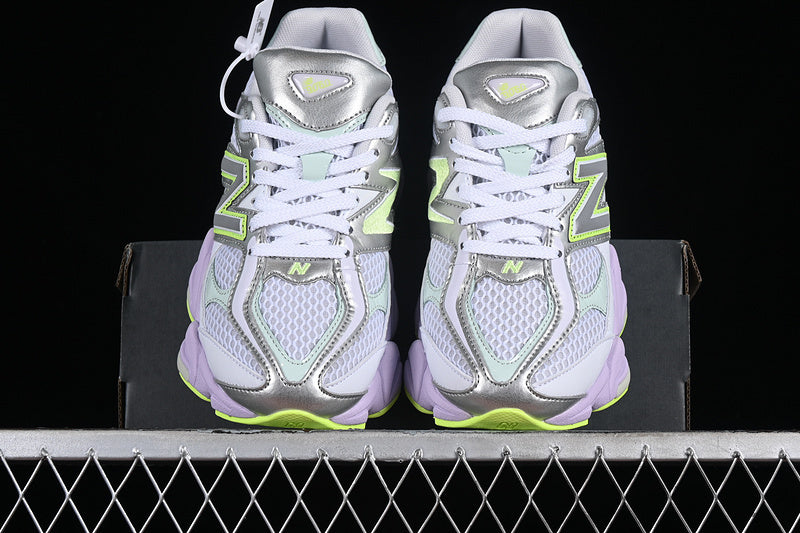 The Joe Freshgoods x New Balance 9060 in White/Grey/Purple/Silver/Green explodes with cosmic fusion and electric vibrancy. Premium suede and mesh overlays, pristine white canvas, cool grey shading, royal purple flashes, shimmering silver metallics, and fresh green pops fuse interstellar energy with modern comfort for the perfect everyday sneaker.